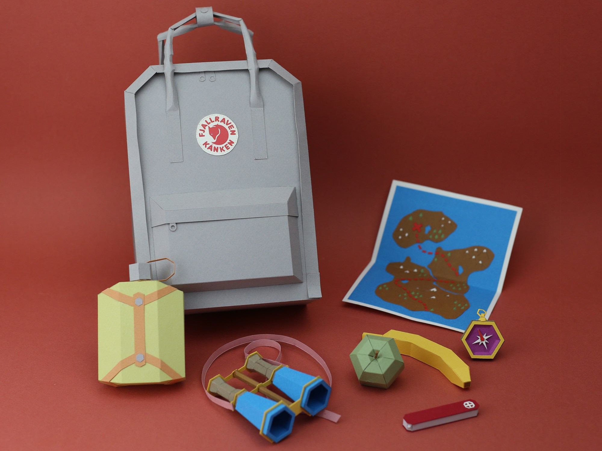 Filled Kanken with a map, compass, knife, binoculars, water canteen and some fruits.