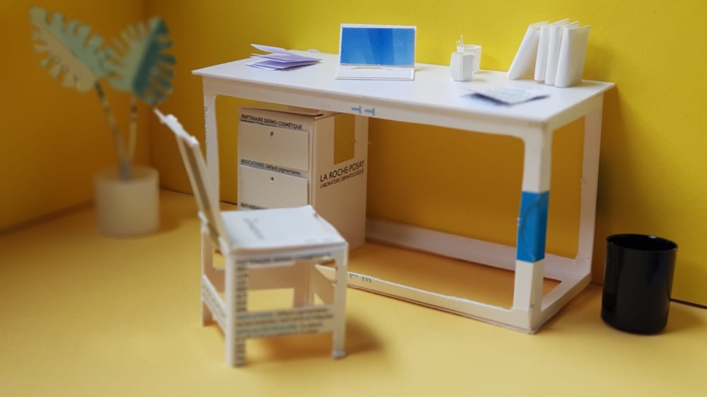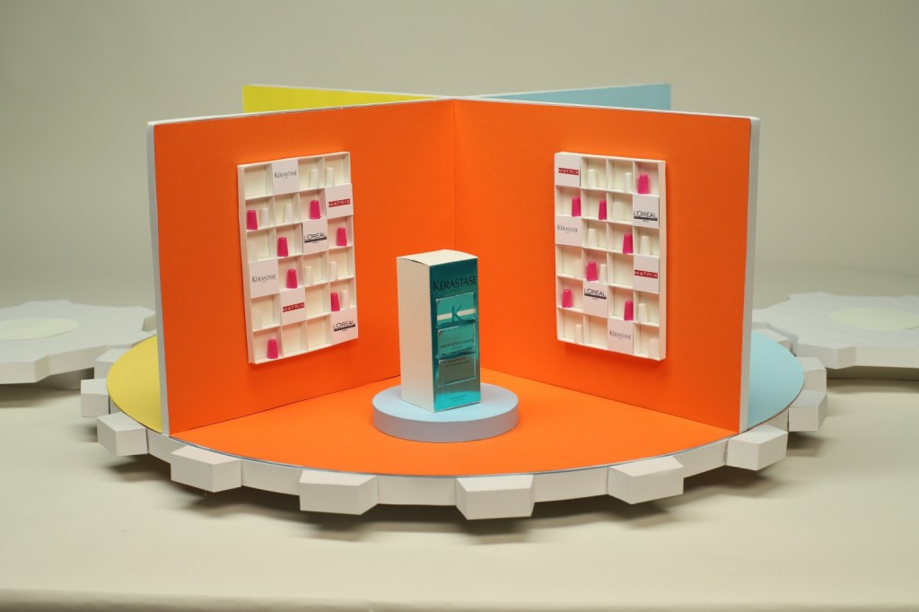 The idea was to create a paper world with the waste materials of L’Oréal Turkey office. The bottles, packages, products, old leaflets… etc. It was challenging for us to bring all the stuff together and use them as the pieces of the scenes. We cataloged the materials, designed the scenes and decided which products would fit in the scene.